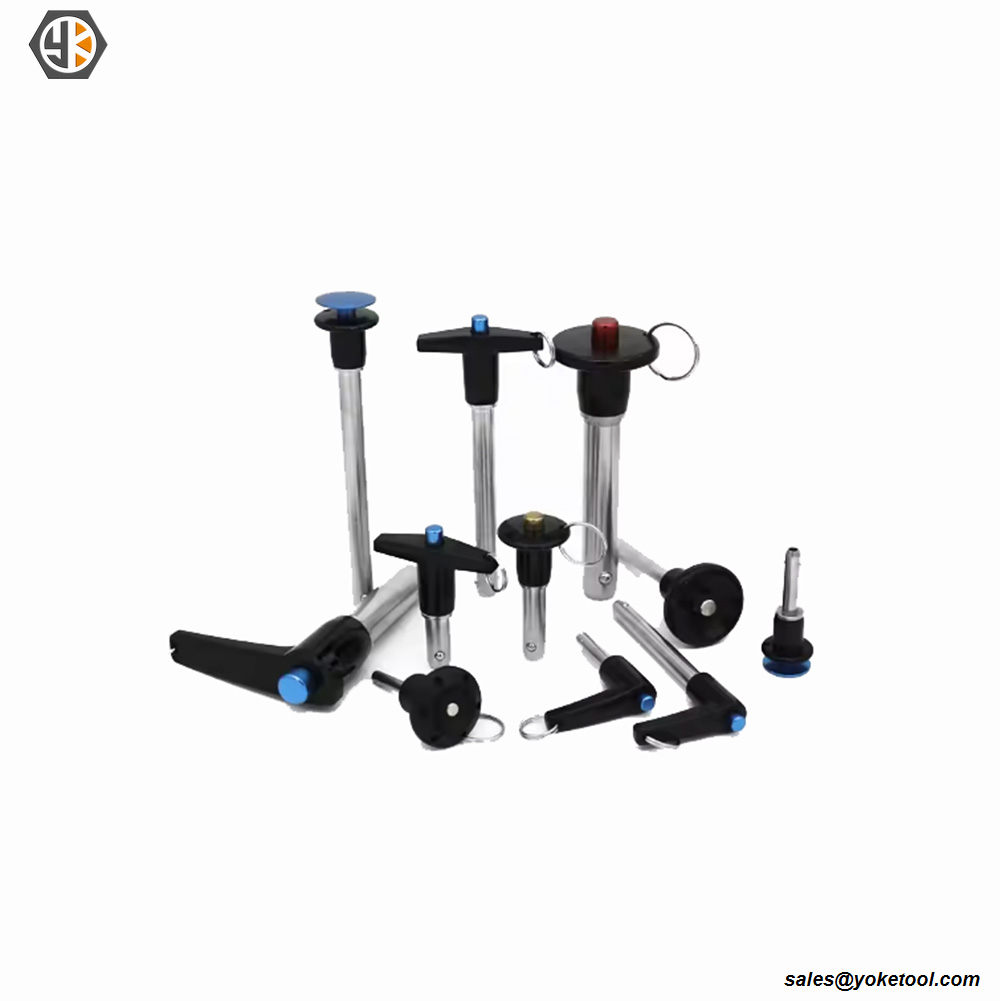 Штыфты Yokelink T Handle Quick Release Pins маюць шырокі спектр прымянення для замацавання, вызначэння месцазнаходжання і выраўноўвання. Штыфты не вызваляцца, пакуль не будзе націснута кнопка на ручцы. Пасля націску кнопкі шарыкі ўцягваюцца ў хваставік, дазваляючы ўстаўляць або вымаць шпільку ў адтуліну або з яе. Хваставік выраблены з нержавеючай сталі 304 або 17-4PH. Ручкі для шпілек, пералічаных ніжэй, выраблены з алюмініевага сплаву і анадаваны чорным колерам. Ручкі з нержавеючай сталі таксама даступныя. Штыфты пастаўляюцца з разрэзным кольцам з нержавеючай сталі для мацавання кабельнага вузла. Штыфты іншай даўжыні ручкі даступныя па спецыяльных заказах.